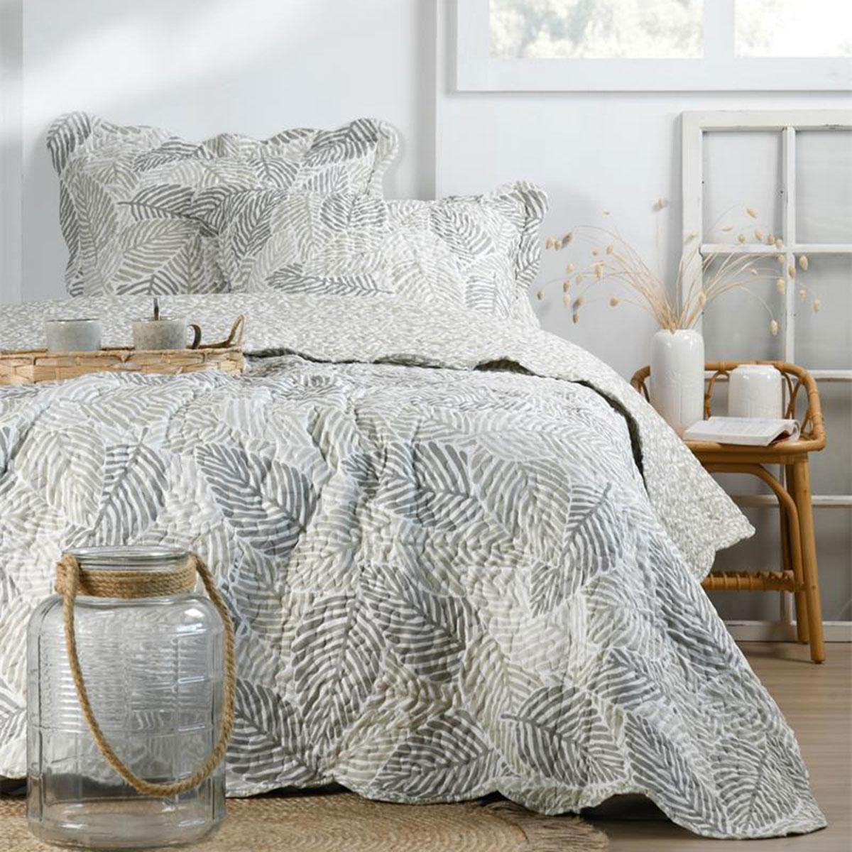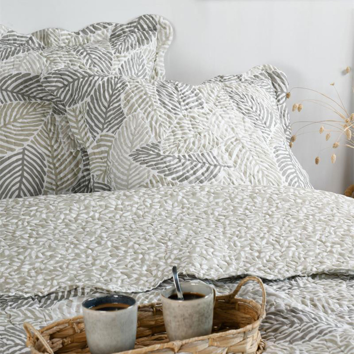 🌸 Marque : Stof 🌸 Modèle : Gally Naturel 🌸 Dimensions boutis : 240 × 220 cm 🌸 Dimensions taies : 63 × 63 cm 🌸 Composition : 100 % polyester 🌸 Entretien : lavage à 30° – séchage à l’air libre conseillé 🌸 Coloris : beige et gris clair – motif feuillage réversible