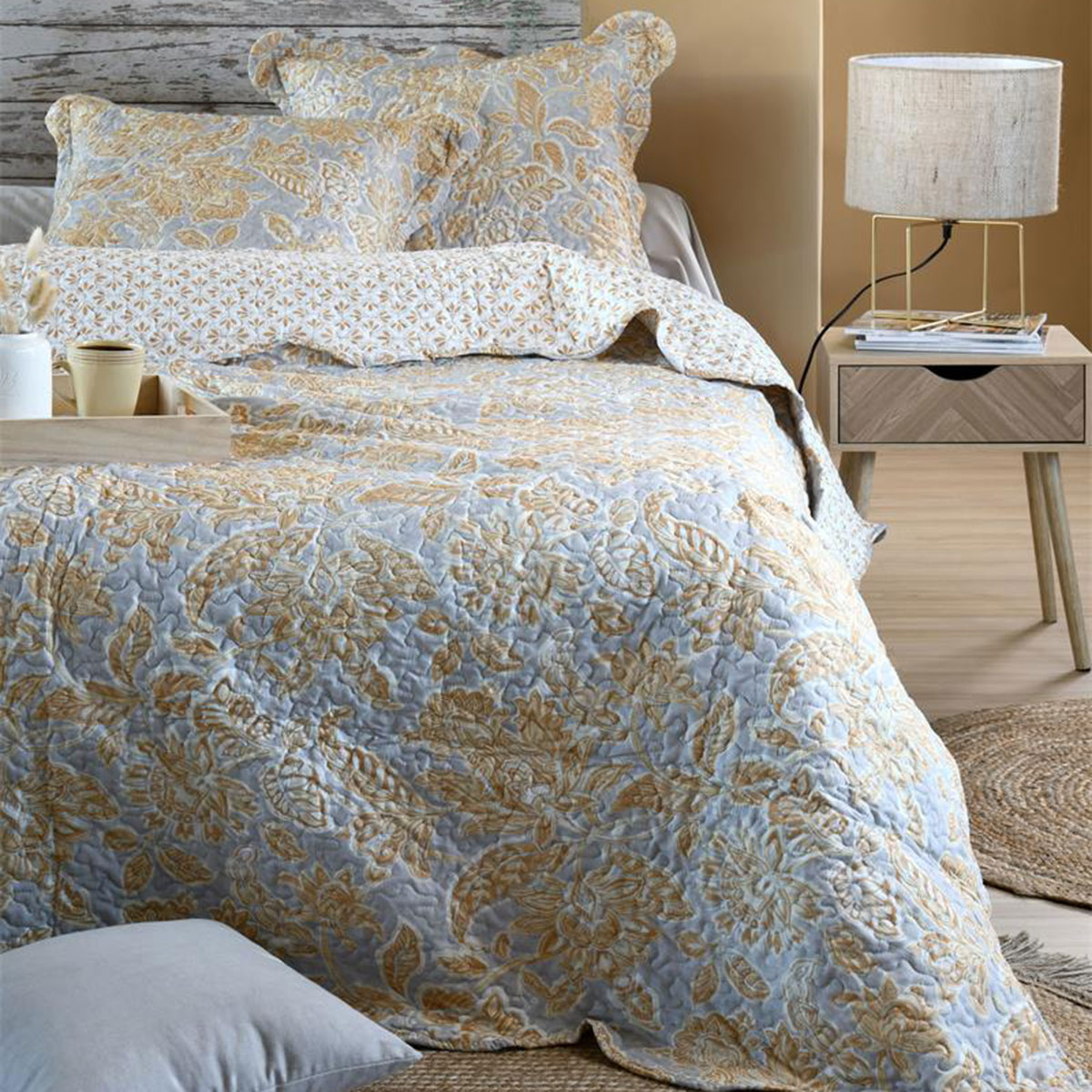 Apportez une note chaleureuse et raffinée à votre chambre avec le boutis Nerya Moutarde signé Lovely Casa. Ce superbe ensemble double face, composé d’un boutis et de deux taies coordonnées, présente un élégant motif floral moutarde sur fond gris clair, idéal pour illuminer votre intérieur avec douceur et modernité.
