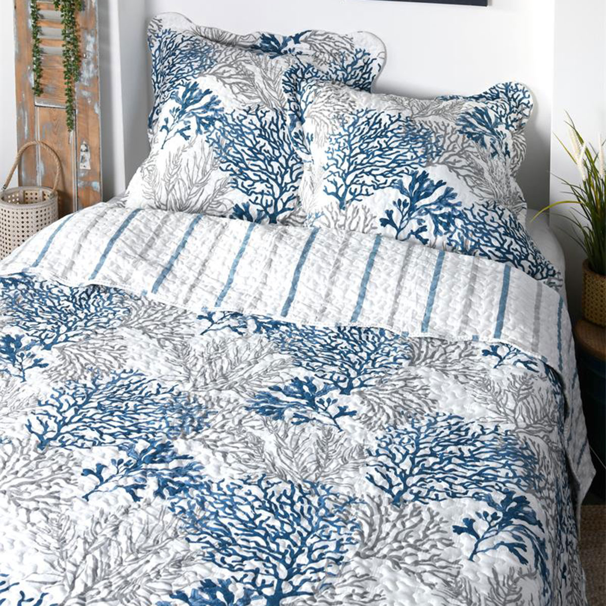 Invitez un souffle marin dans votre chambre avec le boutis Quiberon signé Lovely Casa. Cet ensemble double face, composé d’un boutis et de deux taies assorties, mêle élégamment des motifs de coraux et des rayures marines dans des nuances apaisantes de bleu et de gris clair.