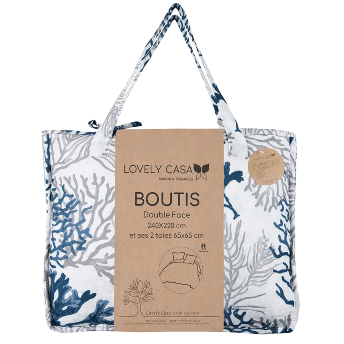🌸 Marque : Lovely Casa 🌸 Modèle : Quiberon Bleu et Gris 🌸 Dimensions boutis : 240 × 220 cm 🌸 Dimensions taies : 65 × 65 cm 🌸 Composition : 100 % polyester 🌸 Entretien : lavage à 30° – séchage à l’air libre conseillé 🌸 Coloris : bleu, gris et blanc – réversible (motif corail / rayures)