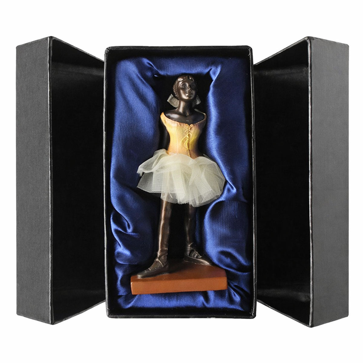 🩰🎨 Figurine Degas – Petite danseuse de quatorze ans – Parastone 🏷️ Fabricant : Parastone 🧵 Matière : Résine 🎨 Couleur : Finition bronze avec tutu beige en tissu 📏 Dimensions : Hauteur : 11,5 cm Largeur : 5 cm Profondeur : 4,5 cm 🎁 Présentation : Livrée dans un coffret de protection Parastone 🩰 Cette figurine rend hommage à l’une des œuvres les plus emblématiques de Edgar Degas, La Petite danseuse de quatorze ans. Reproduite avec finesse par les ateliers Parastone, elle capture toute la grâce, la retenue et l’émotion de cette jeune ballerine devenue un symbole intemporel de la danse classique et de l’art du mouvement. 🎨 La sculpture associe une résine finement travaillée à une finition bronze élégante, rehaussée d’un véritable tutu en tissu beige, fidèle à l’esprit de l’œuvre originale. Chaque détail du corps, de la posture et de l’expression est soigneusement restitué, offrant une pièce décorative à la fois délicate et expressive. 🏡 Grâce à son format compact de 11,5 cm, cette figurine trouve facilement sa place sur une étagère, un bureau, une bibliothèque ou dans une vitrine. Elle s’adresse aussi bien aux amateurs d’art qu’aux passionnés de danse classique, et constitue un bel objet de collection ou une idée cadeau raffinée. 🎁 Présentée dans un coffret Parastone élégant, cette reproduction est idéale pour offrir une œuvre d’art miniature, chargée d’histoire et d’émotion. ❓ Questions fréquentes pour mieux vous guider 🩰 Cette figurine est-elle fidèle à l’œuvre originale de Degas ? Oui, elle s’inspire directement de La Petite danseuse de quatorze ans et en respecte la posture, l’expression et l’esprit artistique. 🎨 Le tutu est-il en tissu ? Oui, le tutu est réalisé en véritable tissu beige, apportant relief et authenticité à la sculpture. 📏 Quelle est la taille exacte de la figurine ? Elle mesure 11,5 cm de hauteur, 5 cm de largeur et 4,5 cm de profondeur. 🎁 Est-elle adaptée comme idée cadeau ? Absolument. Son coffret de présentation Parastone en fait un cadeau élégant pour les amateurs d’art, de sculpture et de danse. 🏡 Où peut-on exposer cette figurine ? Elle est parfaite pour une vitrine, une étagère, un bureau ou un intérieur à l’ambiance artistique et raffinée. 🔍 Mots-clés figurine Degas, petite danseuse de quatorze ans, sculpture danseuse, figurine Parastone, art et sculpture, danse classique, décoration artistique, figurine bronze, cadeau art