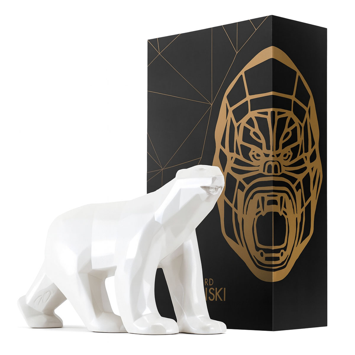 Sous sa magnifique robe blanche nacrée, l’ours arbore le style multi-facettes si caractéristique de Richard Orlinski. Fidèle à l’esprit originel de Pompon, il y ajoute sa propre empreinte : un regard intense, une gueule entrouverte et des lignes ciselées qui évoquent la force tranquille et la modernité.