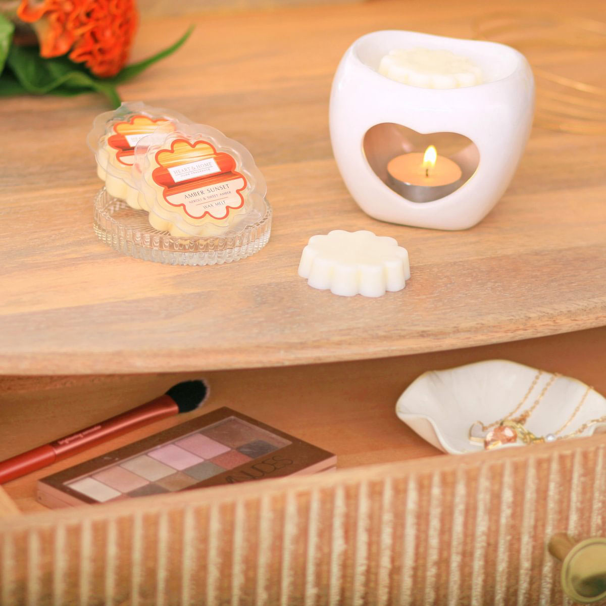 fondant parfumé, wax melt, fondant cire de soja, heart and home, crépuscule ambré, parfum ambre, fondant néroli, fondant agrumes, parfum maison, brûleur parfum, cire parfumée, idée cadeau parfumée, senteur chaleureuse, ambiance cocooning