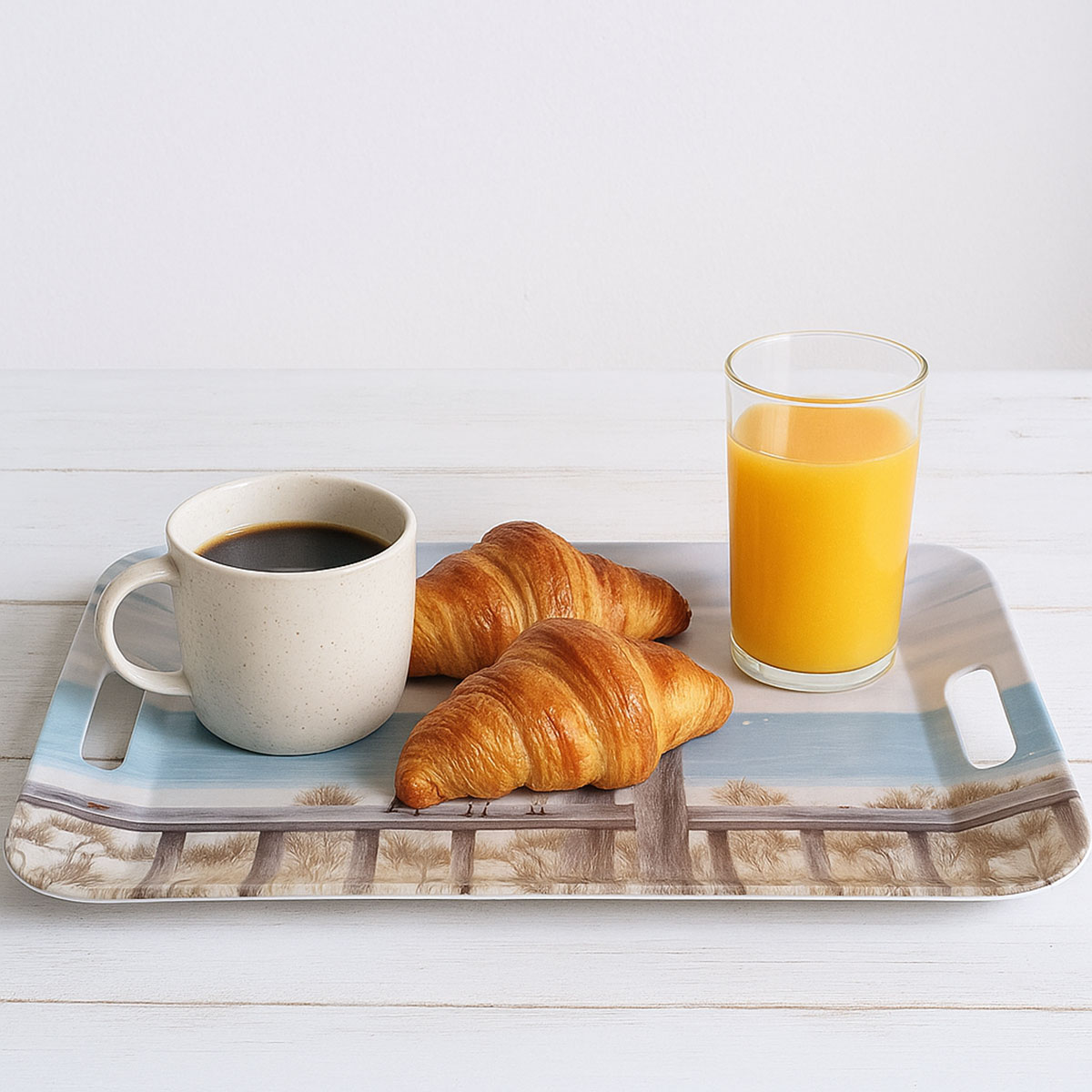 Grand plateau en mélamine – Mouettes sur le quai Marque : Ambiente Matière : Mélamine résistante Couleurs dominantes : Bleu avec motifs de mouettes et détails marins Dimensions : Largeur 46,5 cm - Profondeur 32,5 cm 🌊🕊️ Une brise marine au cœur de votre table Apportez une touche de fraîcheur maritime avec ce grand plateau en mélamine, orné d'un motif charmant de mouettes volant au-dessus des quais. Inspiré par l’air salin et la quiétude des bords de mer, ce plateau évoque la sérénité des paysages côtiers, tout en offrant une grande praticité pour vos repas ou moments de détente. ☕🍴 Fonctionnalité et élégance marines Idéal pour servir un petit-déjeuner, un thé ou un apéritif en toute simplicité, ce plateau associe praticité et raffinement. Sa surface lisse et résistante est idéale pour un usage quotidien, tandis que ses bords légèrement relevés assurent une prise en main confortable et sécurisée. Léger, robuste et facile à nettoyer, il est parfait pour des repas aussi bien en intérieur qu’en extérieur. ✔️ Pourquoi choisir ce plateau ? -