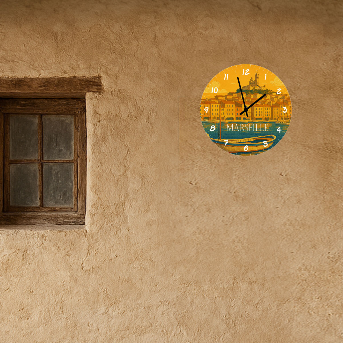 🎨 Horloge Marseille en Verre – CBKréation 🌞 Envie d’ajouter une touche lumineuse et méditerranéenne à votre intérieur ? Cette horloge murale en verre “Marseille” signée CBKréation met à l’honneur le Vieux-Port, ses façades ensoleillées et l’incontournable Notre-Dame-de-la-Garde. Son illustration évoque la chaleur du Sud, les reflets de la mer et l’authentique charme provençal. 🔧 Caractéristiques • Fabricant : CBKréation • Matière : Verre • Dimensions : Diamètre 29 cm – Profondeur 4 cm • Fixation : Système d’accroche inclus • Alimentation : 1 pile AA (non fournie) • Fabrication : Imprimée en France 🕒 Pourquoi choisir cette horloge Marseille ? Parce qu’elle capture l’âme de Marseille avec élégance : un décor vintage, des couleurs chaudes, le port, les toits, la mer et une atmosphère unique. Le graphisme façon affiche rétro crée un véritable tableau mural qui attire immédiatement le regard. Vous cherchez une horloge qui réchauffe une pièce ? Une décoration rappelant le bord de mer ? Un élément mural qui raconte une histoire ? Cette création répond à toutes ces envies. 🌅 Comment s’intègre-t-elle dans votre décoration ? Elle trouve facilement sa place dans : • une décoration bord de mer ou provençale • un intérieur moderne auquel on veut ajouter chaleur et couleurs • un salon, une cuisine, une entrée ou une maison secondaire Le verre imprimé donne de jolis reflets et renforce la profondeur du visuel, pour un rendu élégant et lumineux. 🇫🇷 Qui est CBKréation ? CBKréation est une entreprise française située en Provence, spécialisée dans les objets décoratifs illustrés. Chaque horloge est imprimée en France, garantissant un rendu précis, durable et hautement qualitatif. ✨ Points forts ✔️ Illustration vintage du Vieux-Port de Marseille ✔️ Impression haute qualité sur verre ✔️ Fabrication française ✔️ Installation rapide ✔️ Apporte lumière, couleur et ambiance méditerranéenne horloge Marseille, horloge murale verre, déco Marseille, décoration Méditerranée, horloge vintage, horloge design, décoration Vieux-Port, horloge murale 29 cm, CBKréation