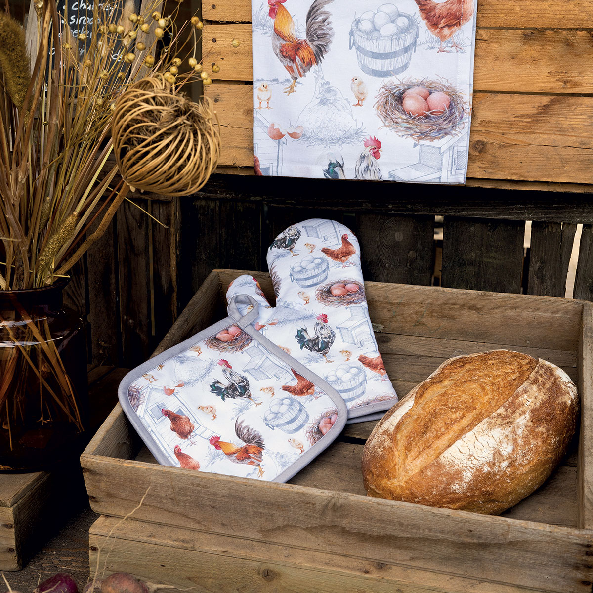 🐔 Ambiance champêtre et charme de la basse-cour : cette manique signée Ambiente nous transporte au cœur d’un jardin ensoleillé où les poules caquettent, les coqs paradent et les poussins trottinent joyeusement autour du poulailler. Un motif bucolique et attendrissant qui apporte chaleur et authenticité à la cuisine.