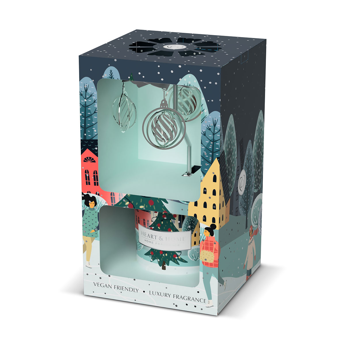 Mini bougie Boules Enchantées Carrousel – Heart and Home Marque : Heart and Home Senteur : Boules Enchantées – Baies rouges & agrumes pétillants Poids de cire : 45 g Durée de combustion : jusqu’à 15 h Dimensions du coffret : Largeur 8,5 cm × Profondeur 8,5 cm × Hauteur 14 cm Composition : Cire de soja naturelle – Mèche en coton – Jarre en verre (réutilisable comme contenant à bougie votive) ✨ Un carrousel parfumé magique Laissez-vous séduire par l’élégance de ce carrousel décoratif qui tourne doucement grâce à la chaleur de la flamme. La mini bougie Boules Enchantées diffuse un parfum fruité et gourmand, créant une atmosphère chaleureuse et féérique dans votre intérieur. Plus qu’une simple bougie, ce carrousel devient une véritable décoration de fête. 🎁 Une idée cadeau originale Présenté dans un coffret raffiné, ce carrousel à bougie est le cadeau idéal pour célébrer Noël ou pour surprendre vos proches avec un objet parfumé aussi élégant que pratique. 🌸 Pyramide olfactive • Note de tête : baies rouges et cassis, gourmandes et pétillantes • Note de cœur : agrumes lumineux, pour une fraîcheur vivifiante • Note de fond : nuances florales délicates, apportant douceur et élégance 📌 À propos de Heart and Home Heart and Home excelle dans l’art des parfums d’ambiance en proposant des créations élégantes et durables à base de cire de soja biodégradable. Chaque bougie est conçue pour éveiller les sens et sublimer le quotidien, avec un engagement fort pour la qualité et l’environnement. 🧾 Ingrédients et avertissements Contient : Linalool, delta-Damascone. Peut produire une réaction allergique. Ne pas brûler complètement. ⚠️ Avertissements : Ce produit chauffe lors de l’utilisation – laisser refroidir avant de démonter. Le carrousel peut présenter des arêtes coupantes. Ne jamais laisser une bougie allumée sans surveillance. Toujours placer sur une surface résistante à la chaleur. Ne pas allumer près de matériaux inflammables. Tenir hors de portée des enfants et des animaux. Laisser 10 cm entre les bougies allumées. Ne pas brûler plus de 3 heures consécutives. Utiliser une allumette longue ou un briquet fin pour l’allumage. Conserver ces informations pour référence ultérieure.