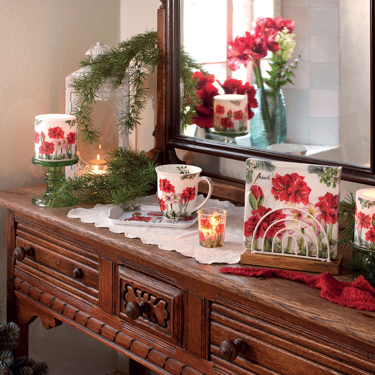 🌺 Ce mini plateau signé Ambiente célèbre la beauté éclatante des amaryllis, ces fleurs d’hiver à la fois majestueuses et pleines de grâce. Sur un fond blanc lumineux, les pétales rouges et rosés s’épanouissent parmi des feuillages verts et des touches délicates de baies blanches. Un dessin raffiné qui mêle fraîcheur végétale et douceur florale, parfait pour apporter une touche d’élégance à votre intérieur.