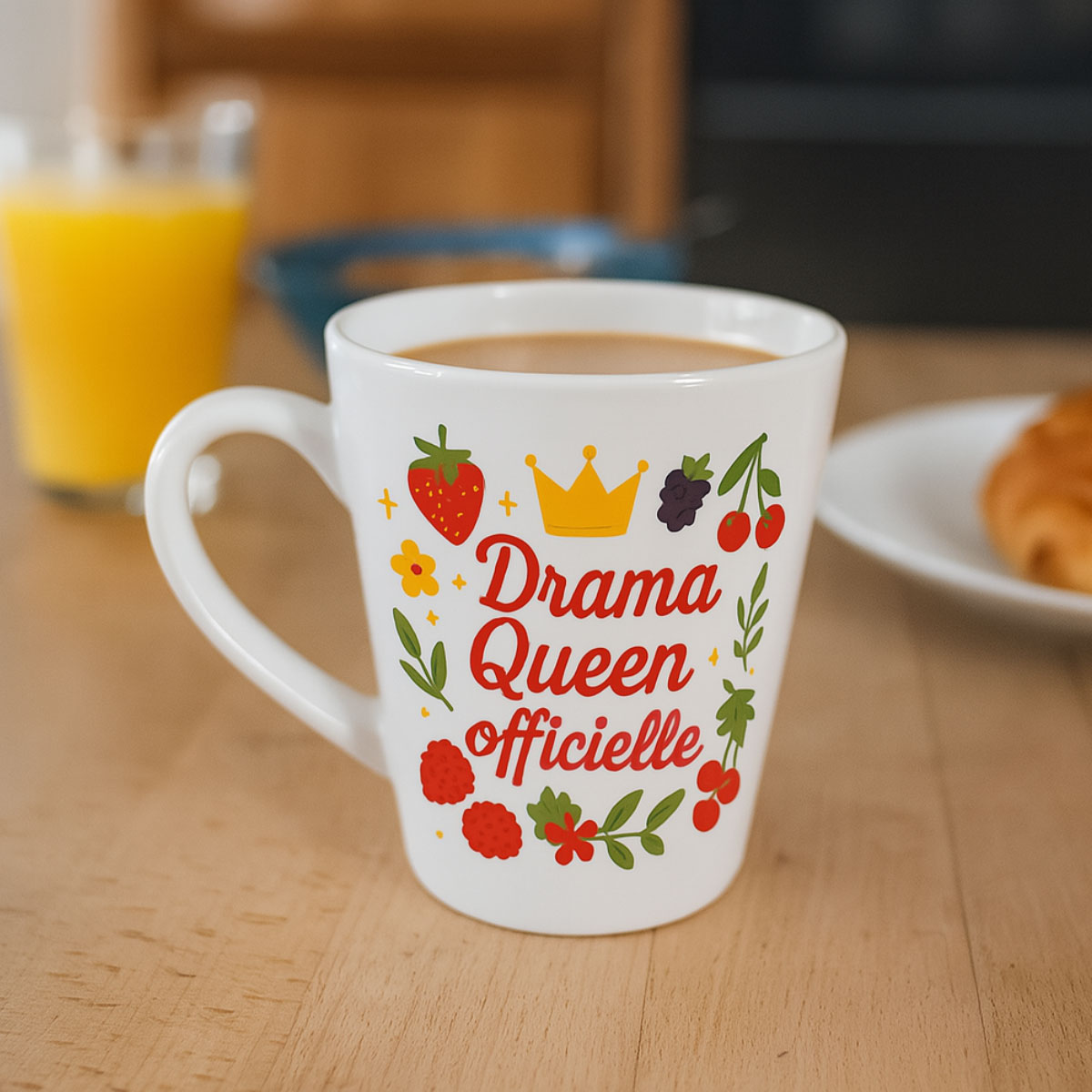 Pour celles qui vivent les émotions en version XXL 👑✨ ! Ce mug conique Drama Queen officielle met à l’honneur les personnalités expressives, pleines de charme et (un peu) théâtrales… toujours avec humour et second degré 🍒