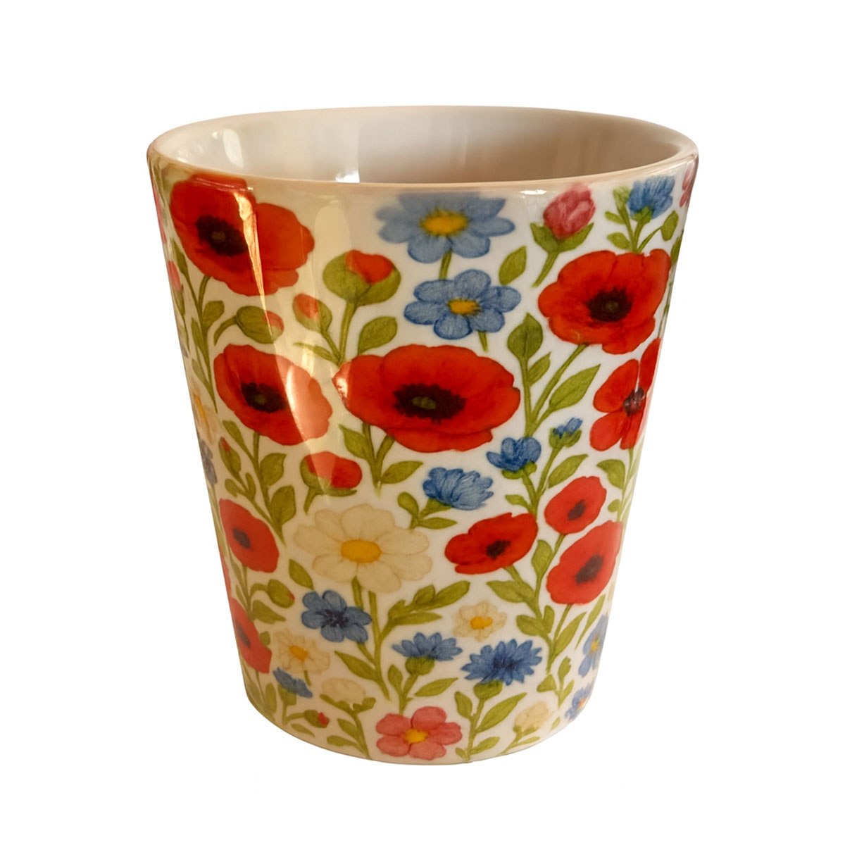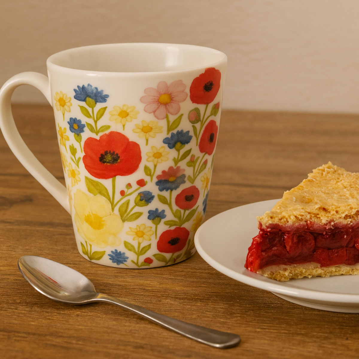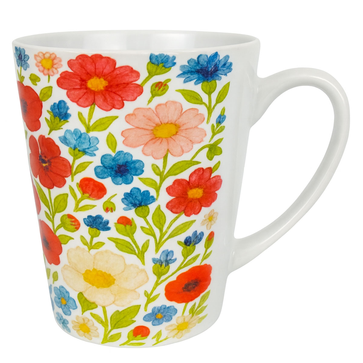 Ce mug conique en céramique apporte une bouffée de nature et de fraîcheur à vos moments de détente. Son motif floral, inspiré des champs d’été, associe coquelicots, marguerites, bleuets et fleurs sauvages dans une composition colorée et lumineuse.