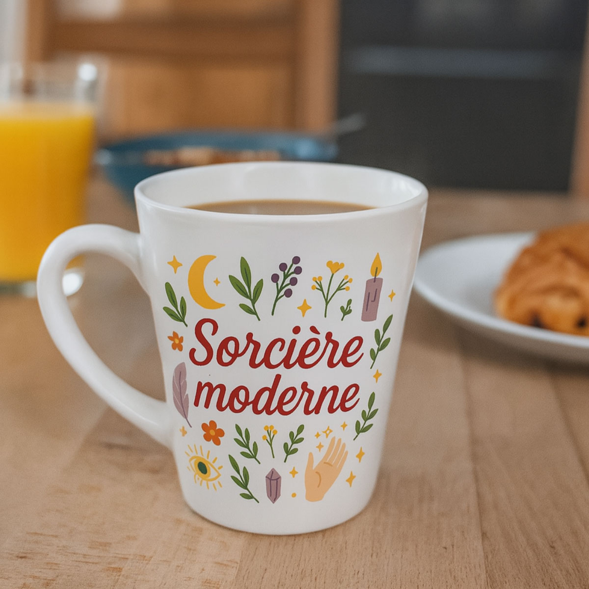 Un mug plein de magie douce et d’énergie lumineuse ✨. “Sorcière moderne” célèbre celles qui cultivent leur intuition, leur force intérieure et leur spiritualité quotidienne avec élégance. Entre lune dorée, plantes sauvages, cristaux et symboles mystiques 🌿🔮, il apporte une touche d’âme à chaque pause café ou infusion.