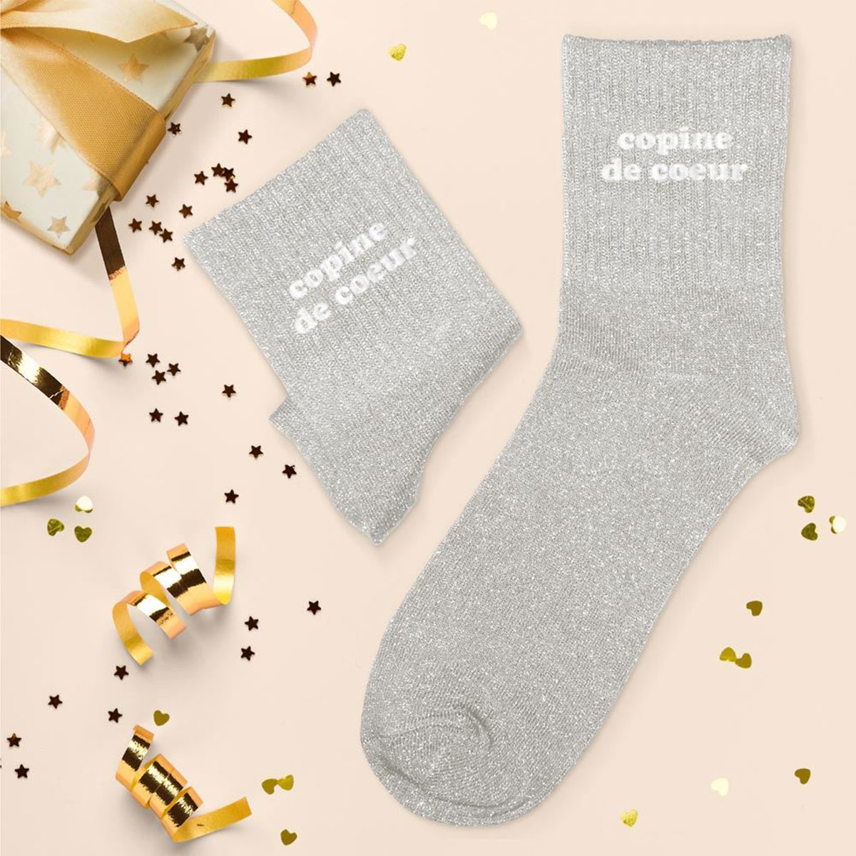 Description : Faites plaisir à votre meilleure amie (ou à vous-même !) avec ces chaussettes pailletées au doux message "Copine de Cœur". Leur teinte grise élégante, agrémentée de paillettes discrètes, en fait un accessoire parfait pour allier style et confort. Douces et légères, elles enveloppent vos pieds d’un confort moelleux tout en ajoutant une touche d’éclat subtil. Ces chaussettes sont idéales pour les moments cocooning ou comme cadeau attentionné pour une personne chère à votre cœur. À propos de la marque : STC est une marque française qui réinvente les chaussettes avec des designs créatifs et modernes. Chaque modèle allie qualité, confort et originalité, offrant ainsi des accessoires à la fois pratiques et tendance pour embellir vos tenues quotidiennes.