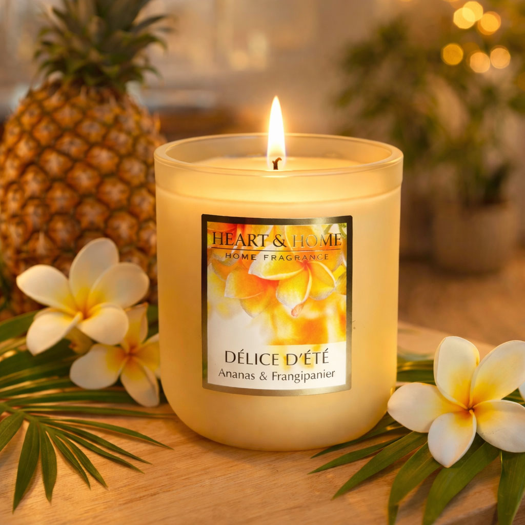 🕯️ Petite bougie parfumée Délice d’été 110 g – Ananas, frangipanier & vanille – Cire de soja – Jusqu’à 30 h – Heart & Home 🏷️ Marque : Heart & Home 🌱 Matière : Cire de soja renouvelable 🧵 Mèche : Coton 🫙 Contenant : Jarre en verre 🔩 Couvercle : Métal ⏳ Durée de combustion : jusqu’à 30 heures 📏 Dimensions : Hauteur 7,5 cm – Diamètre 7 cm ⚖️ Poids : 110 g 🌞 Pyramide olfactive Note de tête : ananas juteux Note de cœur : fleur de frangipanier Note de fond : vanille crémeuse ✨ La petite bougie Délice d’été évoque une escapade ensoleillée aux parfums tropicaux. L’ananas lumineux apporte une fraîcheur fruitée gourmande qui s’ouvre sur la douceur florale du frangipanier. La vanille crémeuse enveloppe la fragrance d’une note chaude et réconfortante qui rappelle les journées d’été insouciantes. 🌿 Sa cire de soja riche en parfum assure une combustion propre et une diffusion homogène pendant près de 30 heures, idéale pour parfumer une chambre, un bureau ou une salle de bain. 🫙 Sa jarre en verre accompagnée de son couvercle en métal protège la cire et préserve l’intensité du parfum tout en apportant une touche décorative élégante à votre intérieur. 💡 Conseils d’utilisation • Couper la mèche avant chaque utilisation • Laisser fondre la cire sur toute la surface lors du premier allumage • Ne pas laisser brûler sans surveillance ❓ FAQ Combien de temps dure la bougie ? Jusqu’à 30 heures. Dans quelles pièces peut-on l’utiliser ? Elle est idéale pour une chambre, un bureau ou une petite pièce de vie. Le couvercle est-il utile ? Oui, il protège la cire de la poussière et aide à préserver la fragrance. Est-ce une bonne idée cadeau ? Oui, son parfum exotique et son format élégant en font un cadeau original et apprécié. 🔎 Mots-clés petite bougie parfumée ananas, bougie délice d’été heart and home, bougie cire de soja 110 g, bougie parfum exotique, bougie frangipanier vanille, bougie jarre verre couvercle métal, bougie ambiance été, bougie parfum maison, bougie mèche coton, idée cadeau bougie parfumée
