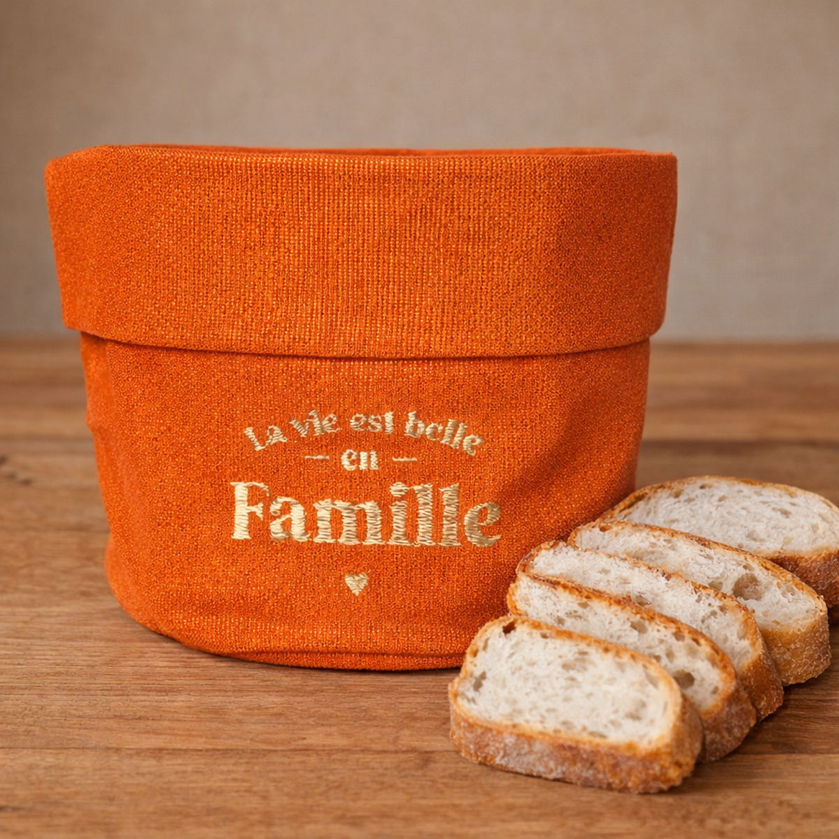 corbeille à pain orange pailleté, la vie est belle en famille, corbeille à pain brodée, corbeille pain coton, accessoire table famille, décoration table conviviale, corbeille à pain STC, idée cadeau maison famille, table chaleureuse, cuisine familiale