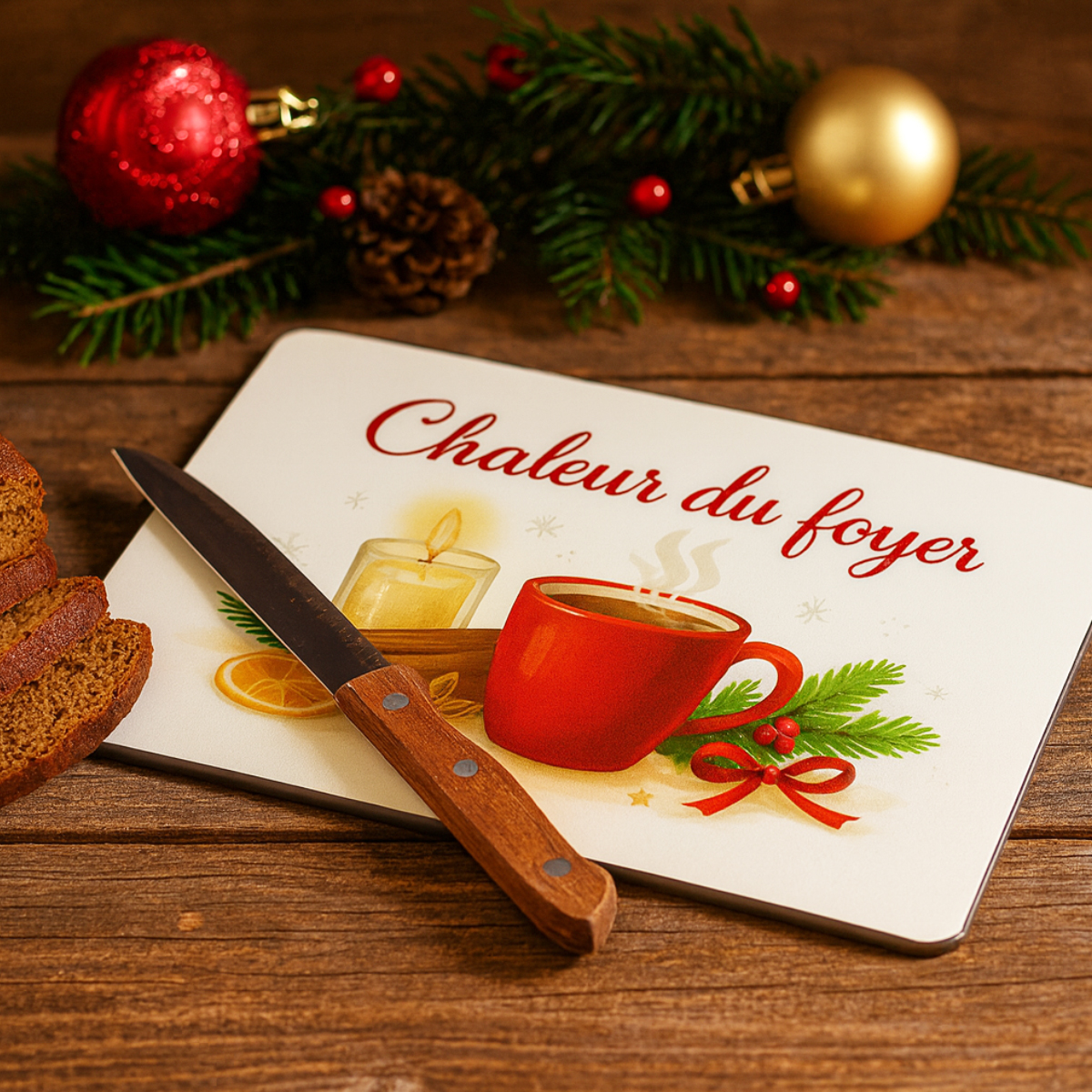 La Planche à Découper Chaleur du Foyer invite à savourer les petits plaisirs d’un hiver doux et réconfortant. Son illustration soignée met en scène une tasse chaude couleur rouge profond, une bougie dont la flamme diffuse une lumière délicate, des rondelles d’orange séchée, de la cannelle, de l’anis étoilé et quelques branches de sapin délicatement décorées. Le tout crée une atmosphère chaleureuse, gourmande et enveloppante qui rappelle les moments paisibles passés à la maison durant la saison des fêtes.