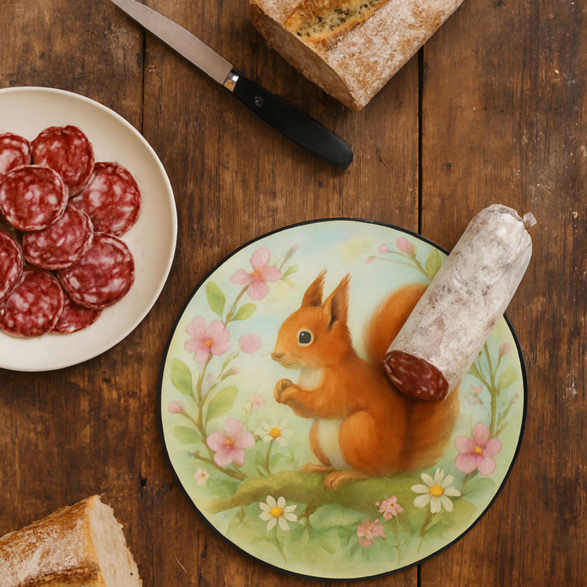 Douce et pleine de poésie, cette planche à découper ronde en verre met en scène un adorable écureuil niché au cœur d’un décor floral délicat. À la fois pratique et décorative, elle trouve naturellement sa place dans la cuisine, où elle apporte une touche de nature et de fraîcheur.