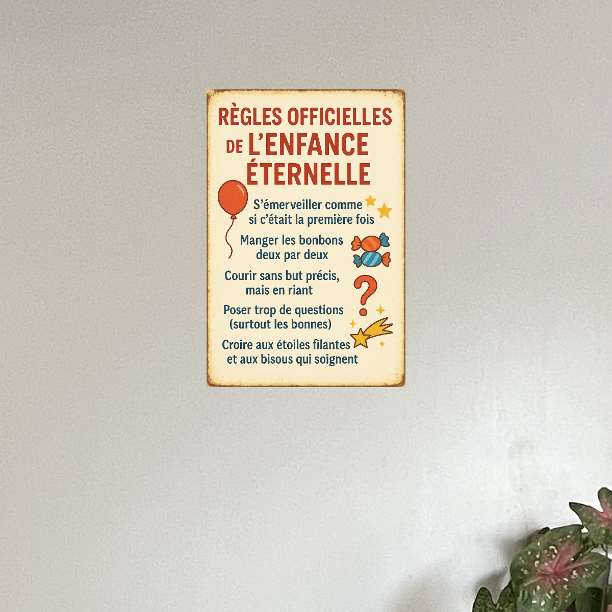 Plaque métal Règles officielles de l’enfance éternelle – CBKréation Fabricant : CBKréation Matière : Métal Dimensions : 30,5 × 20 cm Fixation : Livrée sans système d’accroche Fabrication : Imprimée en France Couleur dominante : Ivoire, rouge et bleu Retrouvez l’esprit d’enfance avec cette plaque métal CBKréation empreinte de poésie et de tendresse. Une invitation à garder son âme d’enfant, à s’émerveiller, courir, poser des questions et croire encore aux bisous qui soignent. Son style rétro délicatement vieilli et ses illustrations colorées (ballon, bonbons, étoiles filantes) rappellent les affiches éducatives d’autrefois. Fabriquée en métal rigide et imprimée en France, elle allie qualité, émotion et charme vintage pour illuminer vos murs avec douceur et optimisme. 💫 Pourquoi choisir cette plaque ? Parce qu’elle rappelle qu’il n’y a pas d’âge pour rêver, rire et s’émerveiller. Une décoration qui parle au cœur et met des étoiles dans les yeux. 🏡 Où l’accrocher ? Dans une chambre d’enfant, un salon, un bureau ou un espace créatif : elle répand sa magie partout où la bonne humeur est la règle d’or. 🎁 À qui l’offrir ? Aux rêveurs, aux grands enfants et à tous ceux qui refusent de grandir trop vite. Un cadeau tendre et inspirant, parfait pour semer un peu de joie dans le quotidien. ✨ Points forts ✔️ Plaque en métal rigide avec impression française ✔️ Texte poétique et optimiste – esprit d’enfance ✔️ Finition patinée – rendu vintage authentique ✔️ Format pratique 30,5 × 20 cm ✔️ Cadeau original pour petits et grands rêveurs 💡 Conseil d’installation Plaque livrée sans système d’accroche. Peut être fixée avec de la pâte de fixation, un ruban double face ou un crochet (non fourni). plaque métal enfance éternelle, décoration murale poétique, plaque déco citations CBKréation, déco vintage murale, affiche rétro positive, idée cadeau bien-être, plaque métal inspiration, déco mur joyeuse