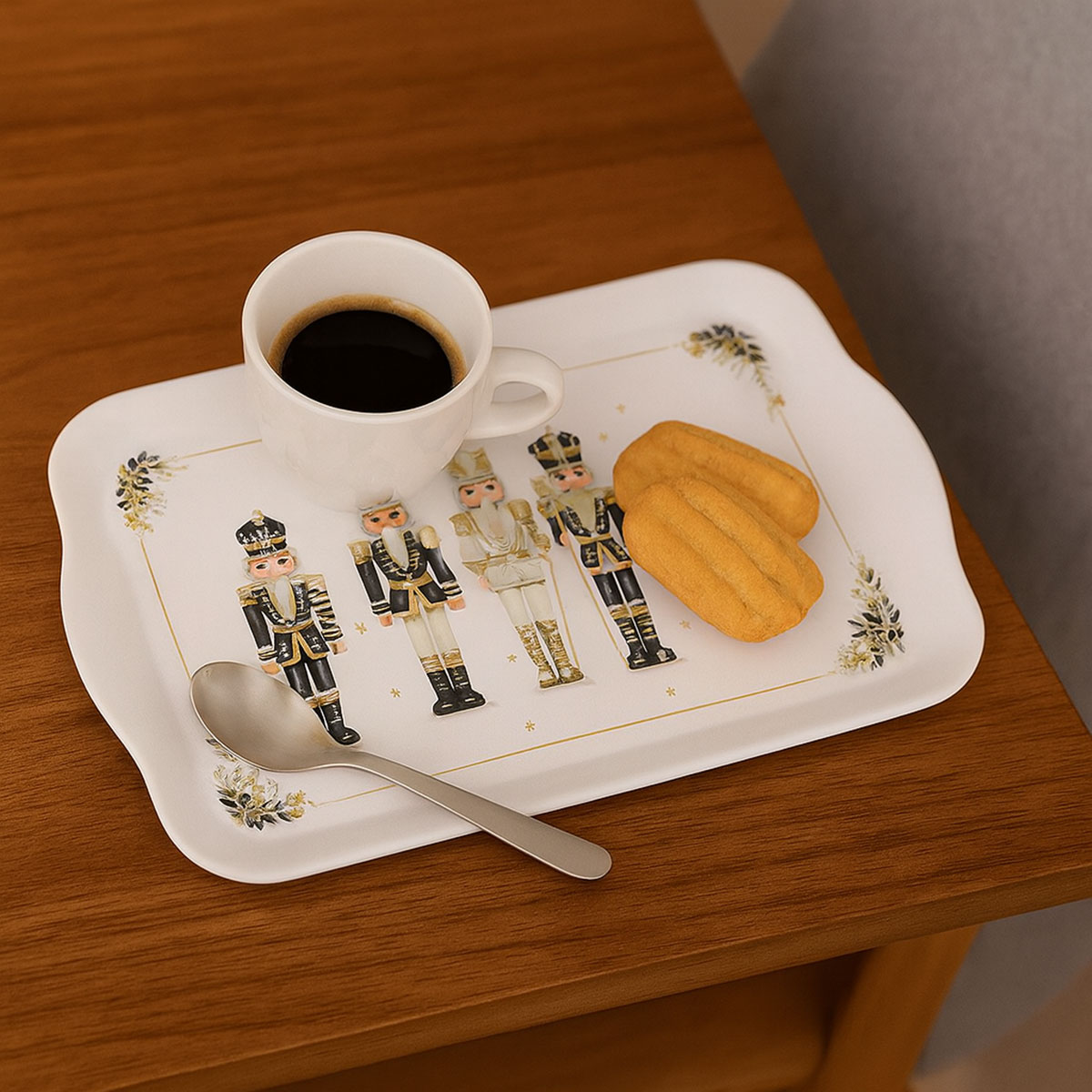 ✨ Une touche d’élégance et de féerie s’invite à votre table avec ce mini plateau signé Ambiente. Sur un fond blanc immaculé, trois superbes casse-noisettes se tiennent côte à côte, vêtus de leurs habits d’apparat noirs, ivoire et dorés. Leurs uniformes royaux scintillent d’éclats subtils, évoquant la grâce des bals d’hiver et la magie du célèbre conte de Noël.