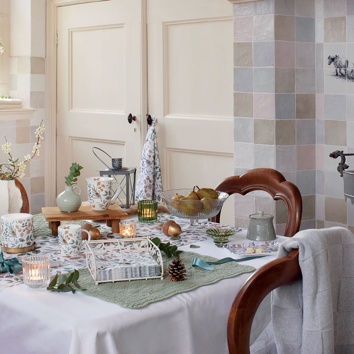 🍃 Élégant et apaisant, ce mini plateau signé Ambiente célèbre la beauté simple de la nature hivernale. Son motif délicatement illustré dévoile un camaïeu de verts et de beiges, où se mêlent feuilles de houx, glands dorés, rameaux d’eucalyptus et petites baies blanches poudrées de givre. Chaque détail évoque les promenades en forêt, l’air frais de décembre et les trésors que l’on ramasse en chemin.