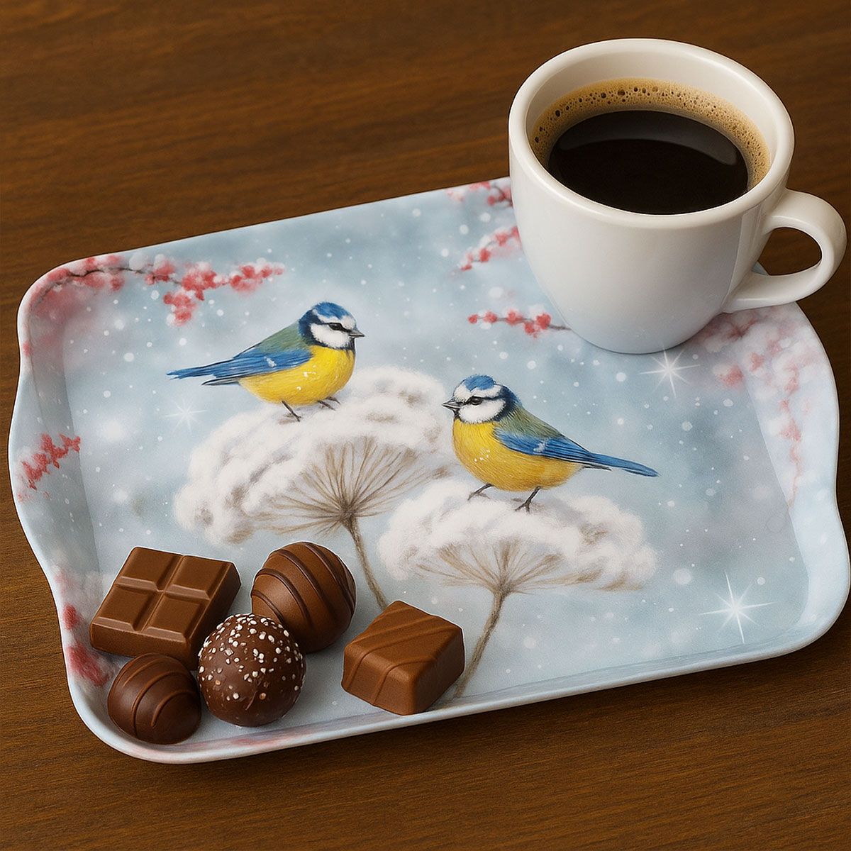❄️ Un souffle de poésie givrée enveloppe ce mini plateau signé Ambiente. Deux délicates mésanges bleues se sont posées sur des tiges enneigées, entourées de baies rouges et d’un ciel poudré d’étoiles scintillantes. Leur plumage jaune et azur illumine la blancheur du décor, comme une promesse de douceur au cœur de l’hiver.