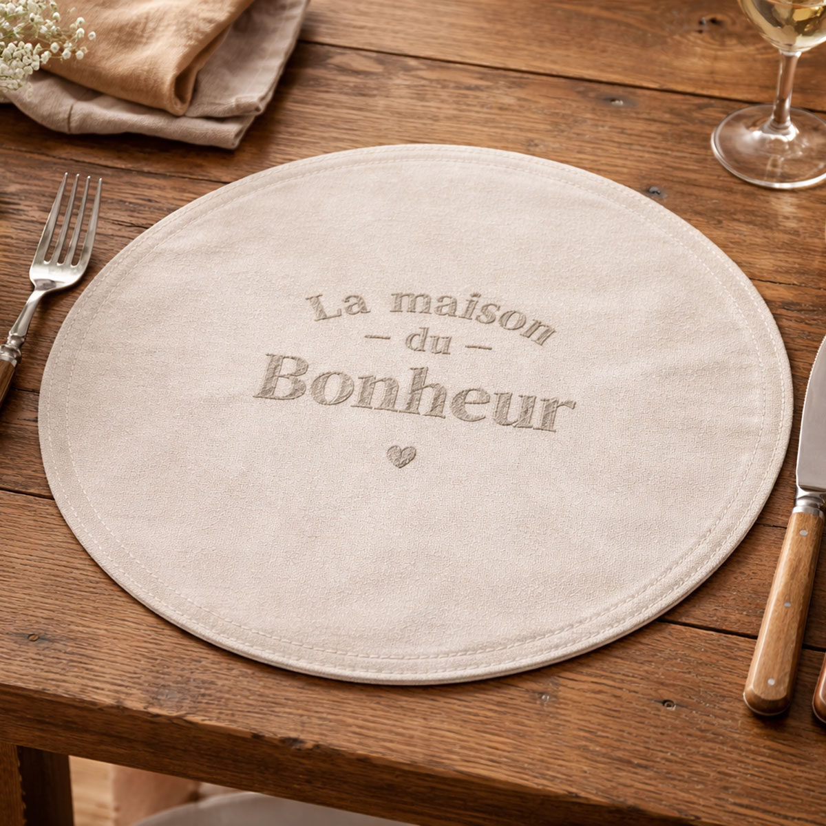 🤍 Set de table rond à paillettes brodé La maison du bonheur – Beige – 38 cm – STC