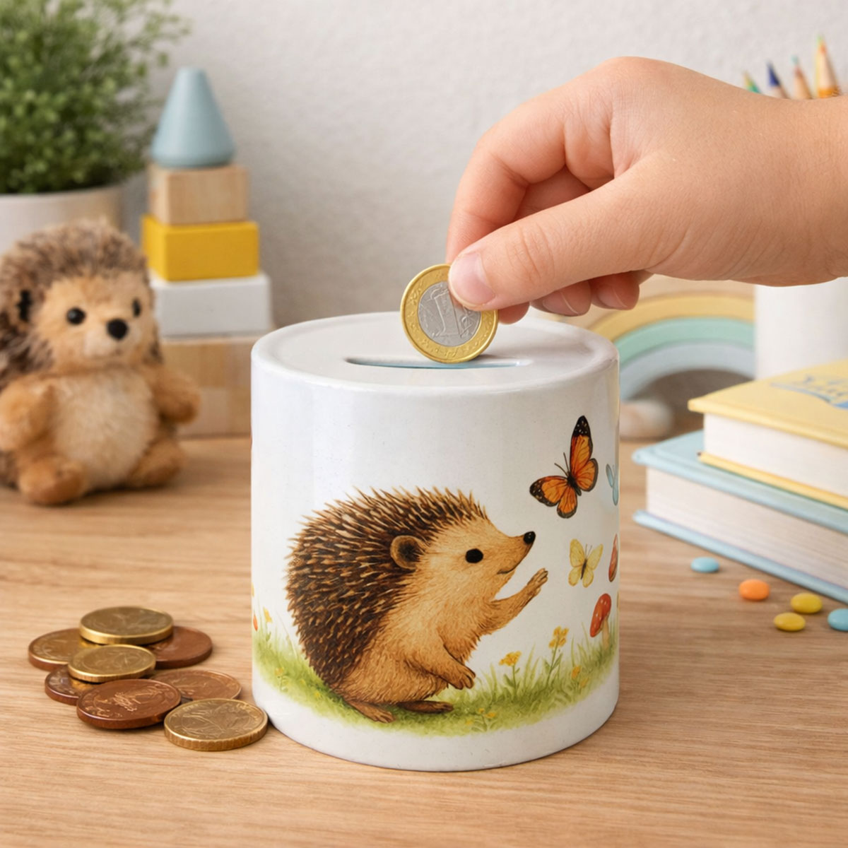 🦔💰 Tirelire hérisson en céramique – 9,5 cm – Impression réalisée en France – CBKréation 🧵 Fabricant : CBKréation 🧱 Matière : Céramique 📏 Dimensions : Hauteur 9,5 cm × Diamètre 8 cm 🔒 Ouverture : Bouchon sous la tirelire 🇫🇷 Impression du visuel réalisée en France Dans un décor de prairie douce parsemée de petites fleurs et de papillons colorés, ce charmant hérisson semble s’émerveiller devant la nature. Cette tirelire en céramique accompagne les enfants dans leurs premières économies tout en apportant une touche tendre et poétique à leur univers. La fente située sur le dessus permet d’y glisser facilement pièces et petits billets. Grâce au bouchon placé sous la base, les économies se récupèrent simplement, sans avoir à casser la tirelire. Son format compact est idéal pour décorer une étagère, une commode ou un bureau d’enfant. L’impression du visuel est réalisée en France 🇫🇷 pour un rendu lumineux, délicat et durable. À la fois objet décoratif et compagnon du quotidien, cette tirelire hérisson trouve naturellement sa place dans une chambre de bébé ou d’enfant, pour apprendre à économiser tout en douceur. ❓ Cette tirelire est-elle adaptée pour une chambre de bébé ? 👉 Oui, son illustration douce et ses couleurs naturelles créent une ambiance rassurante et chaleureuse. ❓ Comment récupérer les pièces ? 👉 Grâce au bouchon situé sous la tirelire, sans avoir besoin de la casser. ❓ Peut-on y mettre des billets ? 👉 Oui, la fente permet d’insérer pièces et petits billets. ❓ Est-ce une bonne idée cadeau ? 👉 Parfaite pour une naissance, un anniversaire ou pour compléter une décoration sur le thème de la nature. ❓ Quelles sont ses dimensions ? 👉 Elle mesure 9,5 cm de hauteur pour 8 cm de diamètre. ❓ Le visuel est-il imprimé en France ? 👉 Oui, l’impression est réalisée en France 🇫🇷. tirelire hérisson enfant, tirelire céramique 9,5 cm, tirelire animaux forêt, tirelire chambre bébé nature, tirelire avec bouchon, impression réalisée en france, cadeau naissance mixte, tirelire CBKréation, tirelire décoration enfant, tirelire hérisson mignon