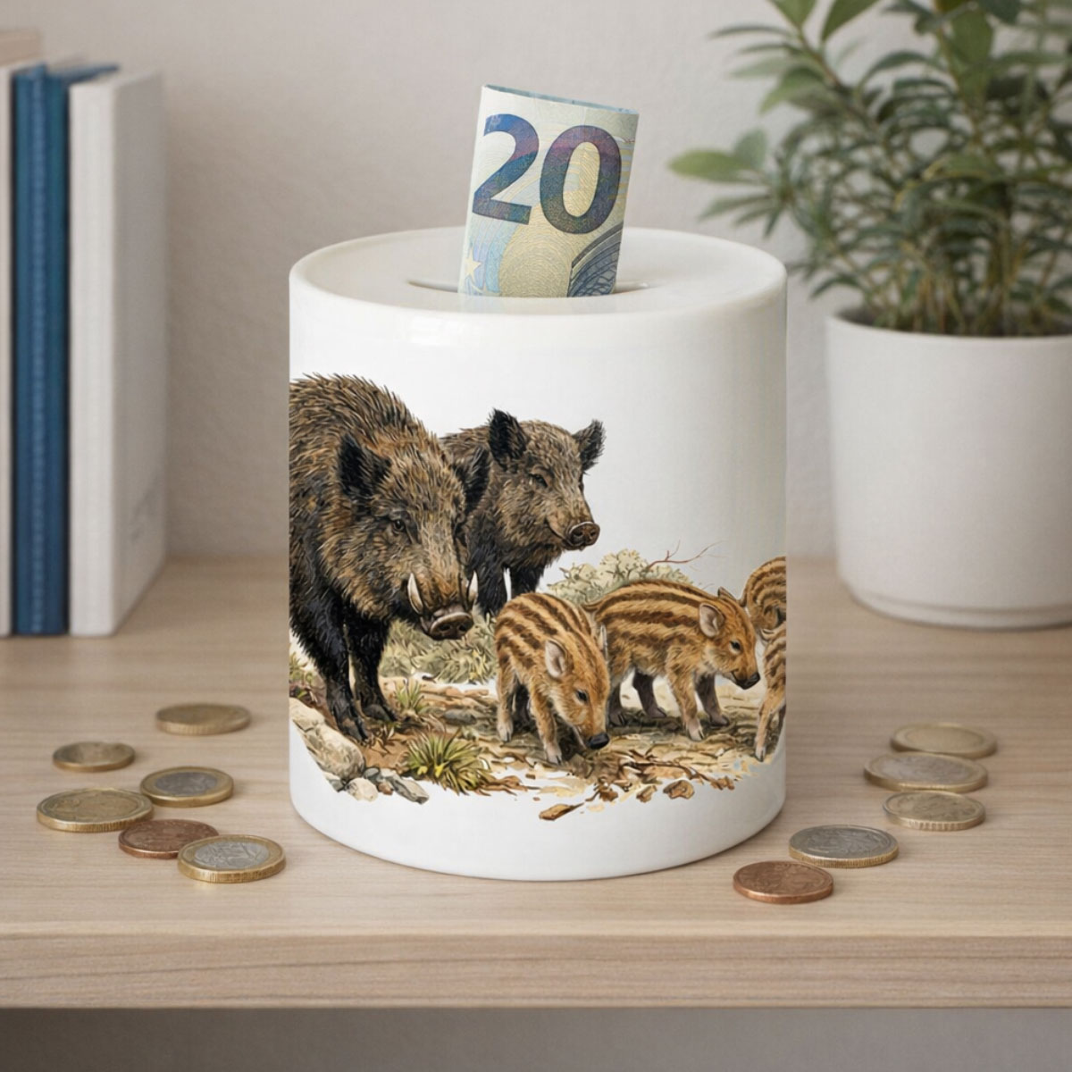 🧵 Fabricant : CBKréation 🧱 Matière : Céramique 📏 Dimensions : Hauteur 9,5 cm × Diamètre 8 cm 🔒 Ouverture : Bouchon sous la tirelire 🇫🇷 Impression du visuel réalisée en France Deux sangliers adultes occupent le centre de la composition. Leur pelage est sombre, épais, avec une texture bien rendue. Leurs défenses sont visibles, ce qui renforce l’aspect sauvage et robuste de l’espèce.